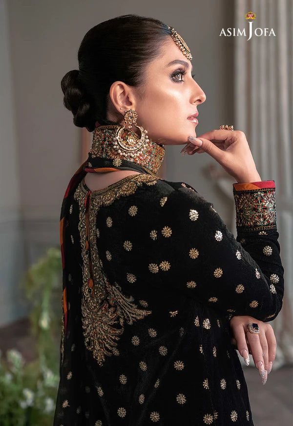 Sleek, luxurious texture perfect for formal or festive wear.The black velvet base adds a regal touch, making this ensemble a perfect choice for winter weddings, parties, and formal gatherings. With Asim Jofaβs unmatched design excellence, this unstitched masterpiece brings both comfort and glamour in one.