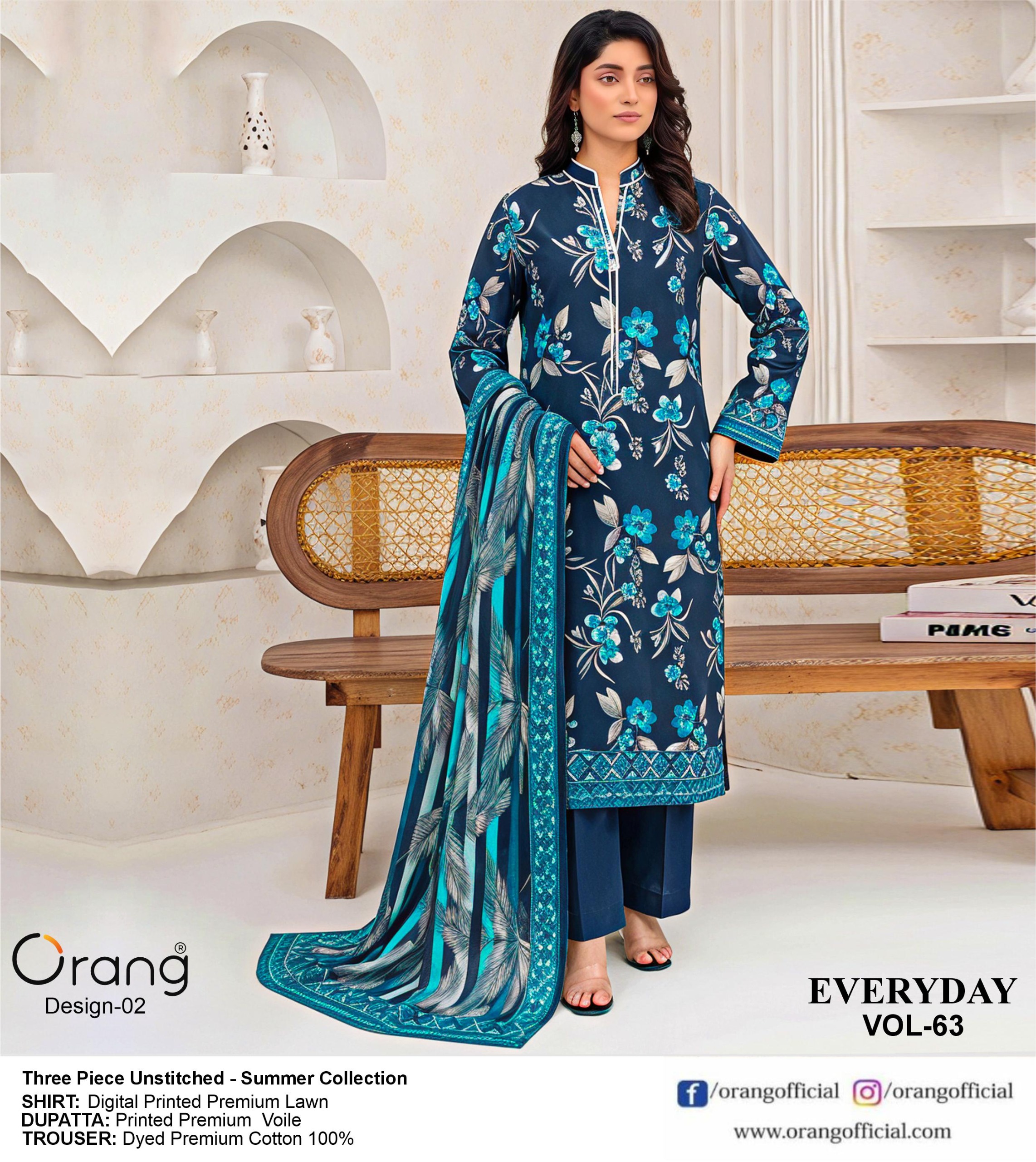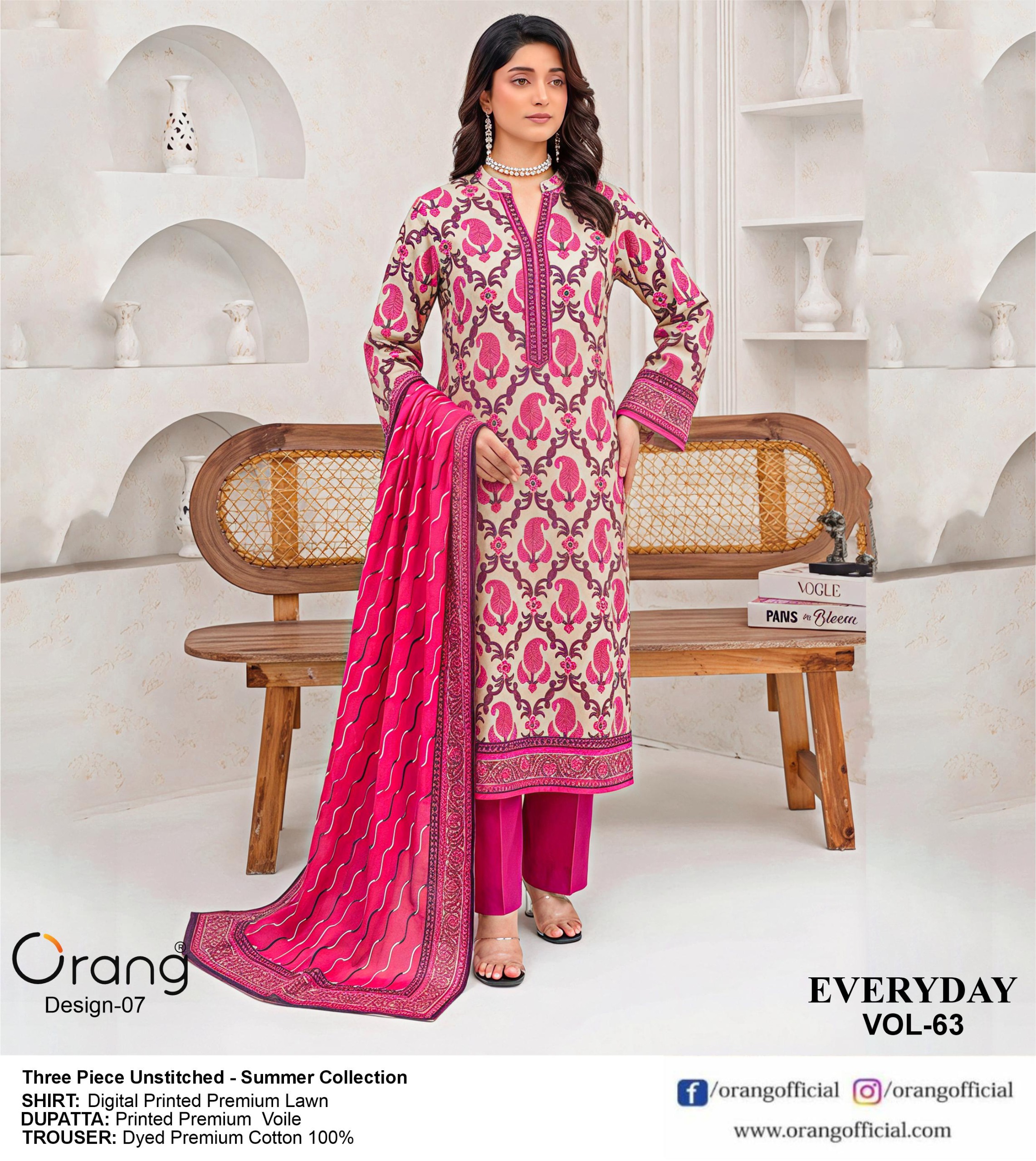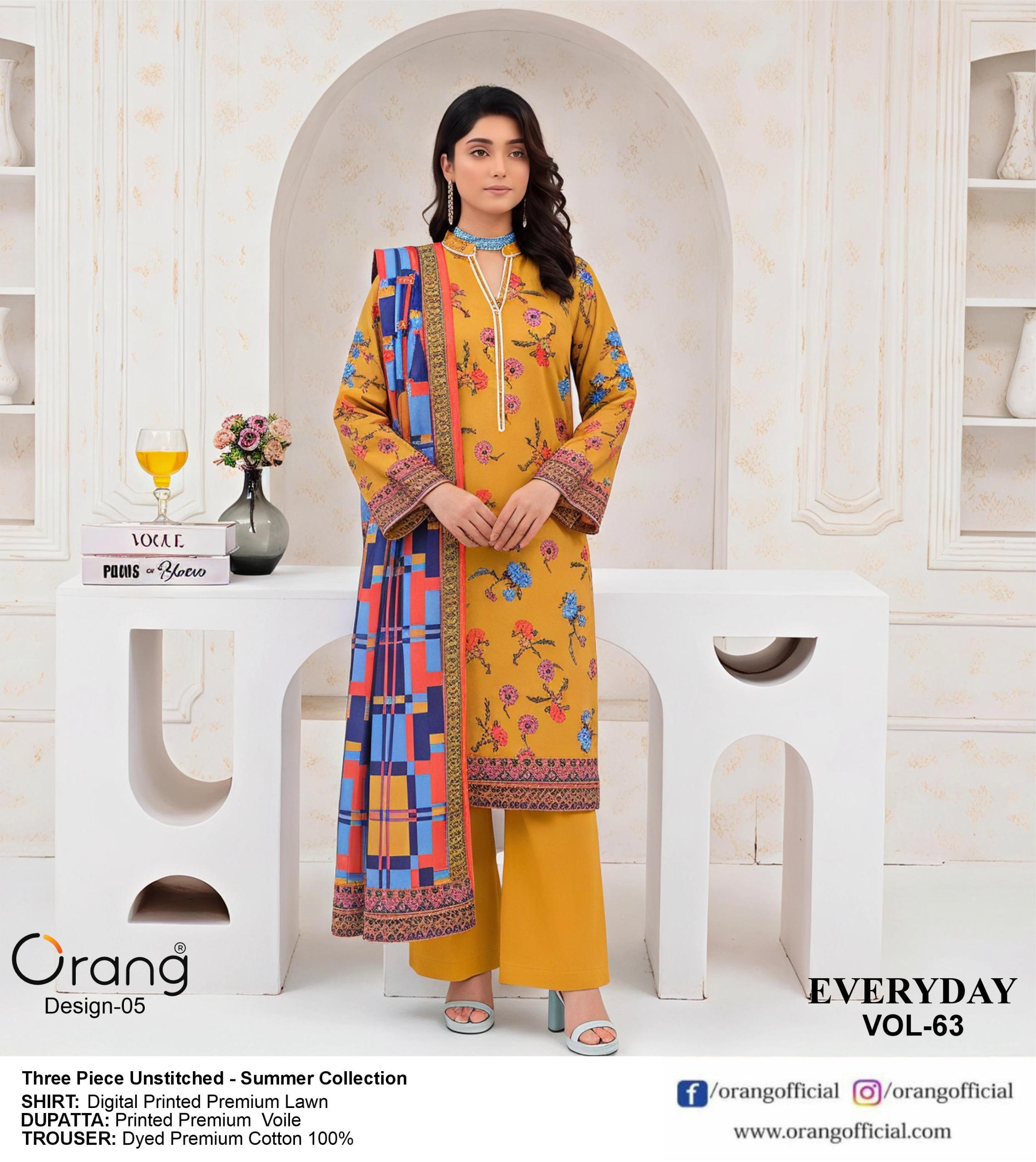 Refresh your seasonal collection with this beautiful Orang 3-piece premium lawn dress. Designed with comfort and elegance in mind, this outfit includes a pure lawn shirt crafted from breathable fabric, making it ideal for warm weather. Paired with a graceful printed voil dupatta that adds charm and style to your overall look. The dyed silk trouser completes the outfit with a classy and polished finish.